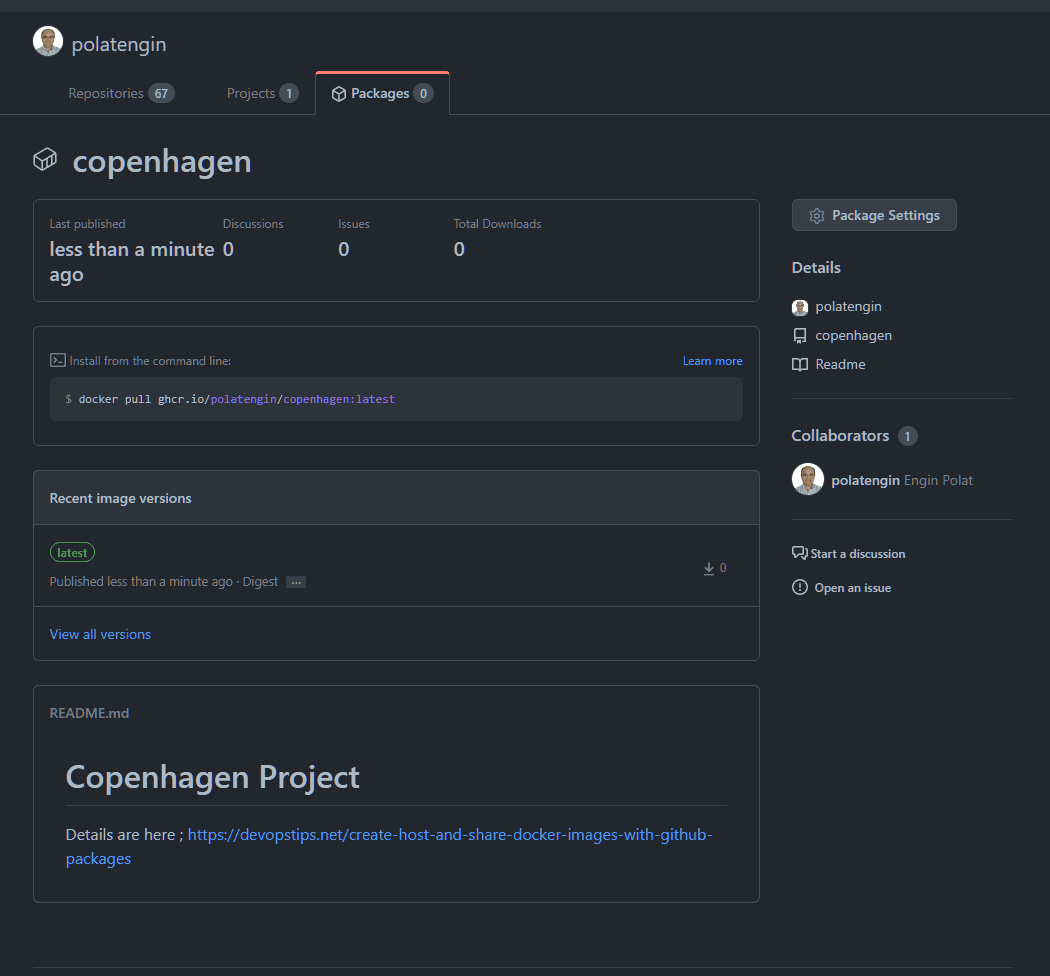 docker push ghcr.io/polatengin/copenhagen:latestAfter the Docker Image has been pushed, we can consume it in our projects;